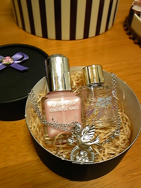 黒い小箱には、優しいピンクのネイルと、小さな香水と、鳥さんネックレスが。可愛いの、すごい可愛いの。