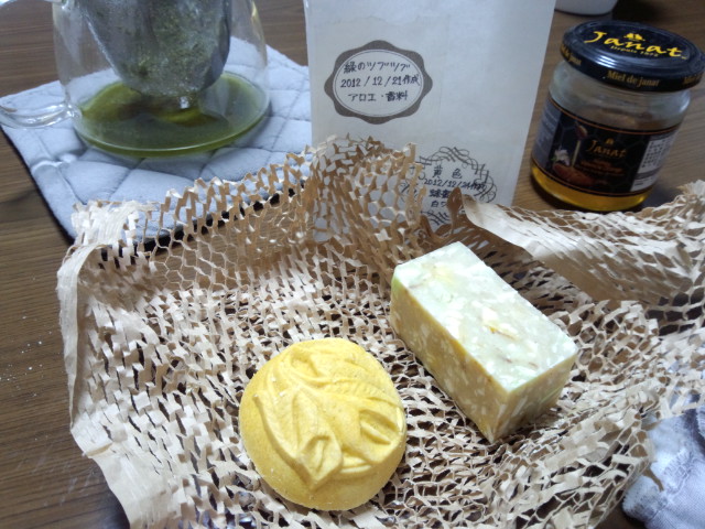友人ちに転がり込んで、夕飯ごちそうになったり、旅行土産もらったり、話聞かせてもらったり、そして手作りの石鹸などいただいてしまったり…!!!(写真)