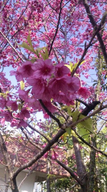 沖縄の桜の写メです。少し暗くなっちゃったけど、向こうの桜は濃いピンクなんだって。
