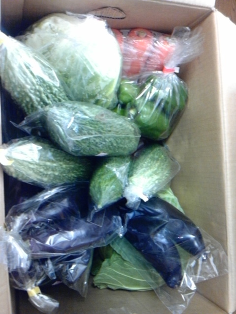 サイユウシティのおばあちゃんから野菜届いた!ゴーヤにレタス、なす、キャベツ、かぼちゃ、にんじん、ピーマン、きゅうり、黒糖、さつま揚げが入ってた。嬉しい。