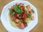お昼ご飯のぱすた。ごろごろトマトとたっぷりバジル!